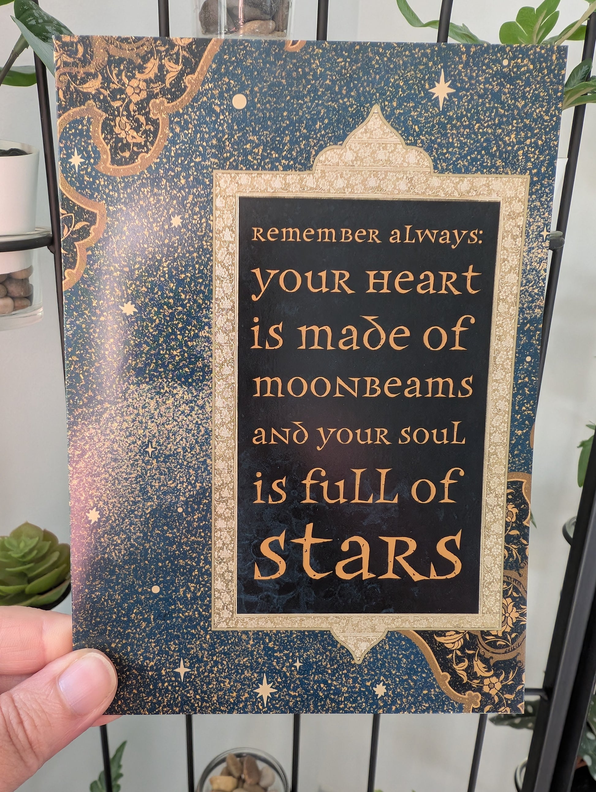 Express heartfelt inspiration with the "Your Heart is Made of Moonbeams" greeting card. Its gentle message and elegant design offer a meaningful way to uplift and encourage loved ones. Perfect for sending warmth and positivity, this card turns simple words into a lasting reminder of light and love.